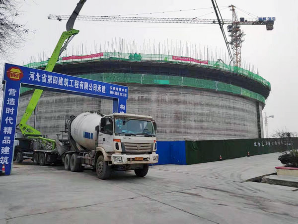 熟料儲存及輸送筒倉直徑60米,高20.5米。1月11日,業(yè)主項目負責人王利杰組織召開(kāi)專(zhuān)題會(huì )議,鄭重要求1月20日前滑模施工必須完成。面對業(yè)主早日投產(chǎn)的殷切期盼,項目部緊急組織施工策劃,明確搶進(jìn)度措施辦法,全體動(dòng)員,多點(diǎn)發(fā)力,全力以赴?;J┕?。在動(dòng)員會(huì )上,成立了以項目經(jīng)理為組長(cháng)的滑模領(lǐng)導小組,班子帶班,明確責任目標;與作業(yè)班組簽訂安全、質(zhì)量承諾書(shū),增強其責任意識;購置鋼筋間距測量設備,節省驗收鋼筋工程時(shí)間和人力。由于疫情原因,現場(chǎng)勞力不能迅速到位,項目部提前組織管理人員晚上加班吊運鋼筋、水泥、腳手板等材料,大家高漲的干勁兒在滑?,F場(chǎng)起到了積極的帶動(dòng)作用。庫壁預應力鋼絞線(xiàn)設置較為密集,每間隔26厘米一道,而且帶有柔性,往庫壁鋼筋內穿設時(shí)容易跑偏,工作效率低。為加快施工,技術(shù)人員巧妙地在庫壁鋼筋上加設了U型鋼筋固定鋼絞線(xiàn)穿行位置,然后大家一字排開(kāi),“一二、一二……”齊聲喊著(zhù)口號,有節奏地用力將鋼絞線(xiàn)在庫壁鋼筋里穿行直到扶壁柱。數九隆冬的夜間滑模平臺上氣溫很低,但是大家的工作熱情不減,干勁不退,抬鋼筋、綁鋼筋、穿鋼絞線(xiàn)……,干得熱火朝天,沒(méi)有人叫苦喊累,在大家的共同努力下,滑模以每天2.7米的速度快速推進(jìn)。